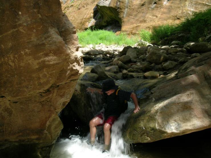 It starts out hot and dry, and ends up wet and fun. The bottom part is called “the waterpark” because of the small slides and pools that must be negotiated (very easily). It also ends up joining with the Virgin River canyon so you get to hike part of that famous canyon.
