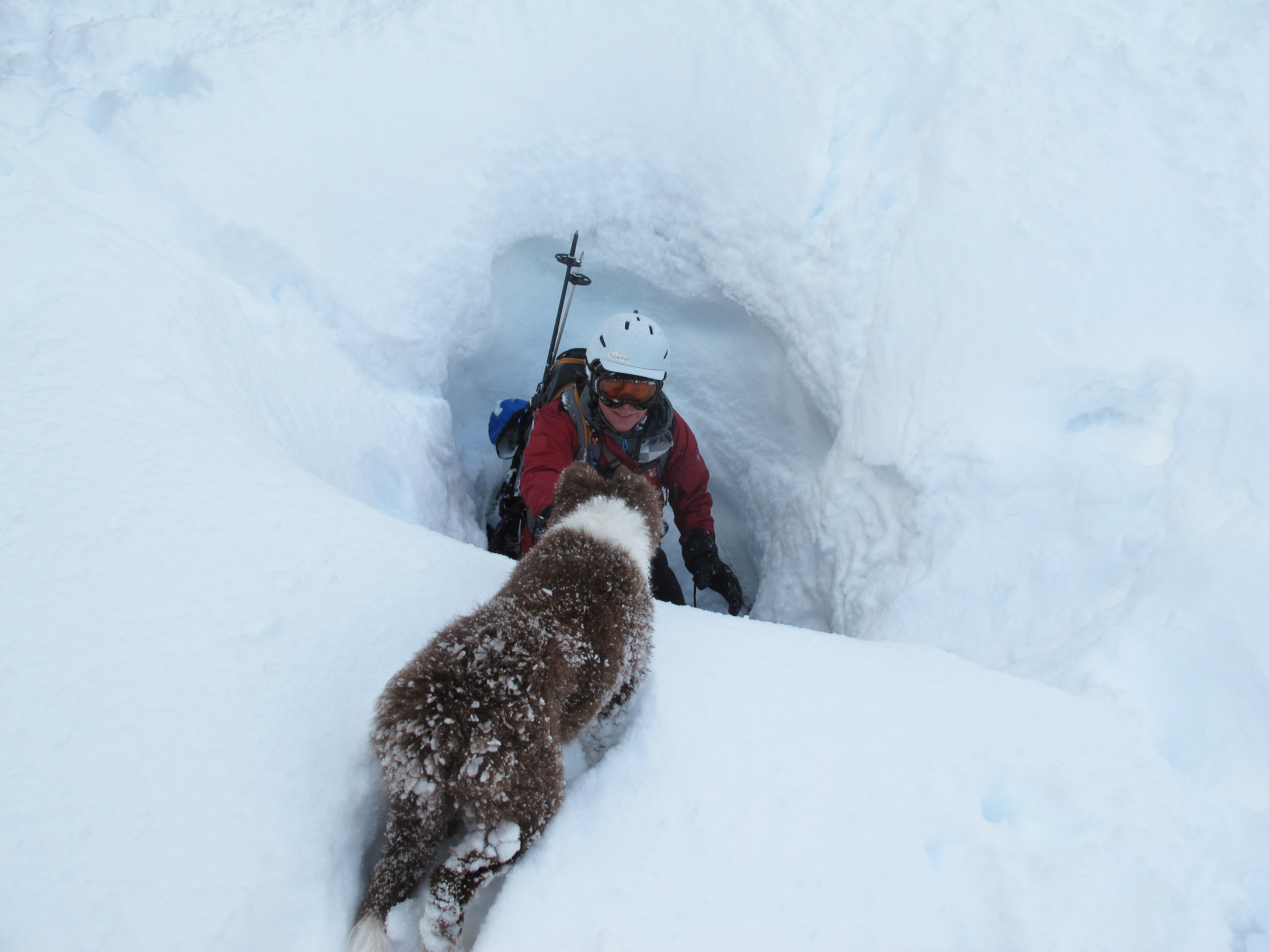 We had a little event on the way down with our new border collie puppy, Ande. He isn’t that old (3 1/2 months), but he has plenty of energy so we decided to take him backcountry skiing. Everything was fine until he ran headfirst into a deep hole over a creek. Betsy literally jumped into the shallow water to get him out.