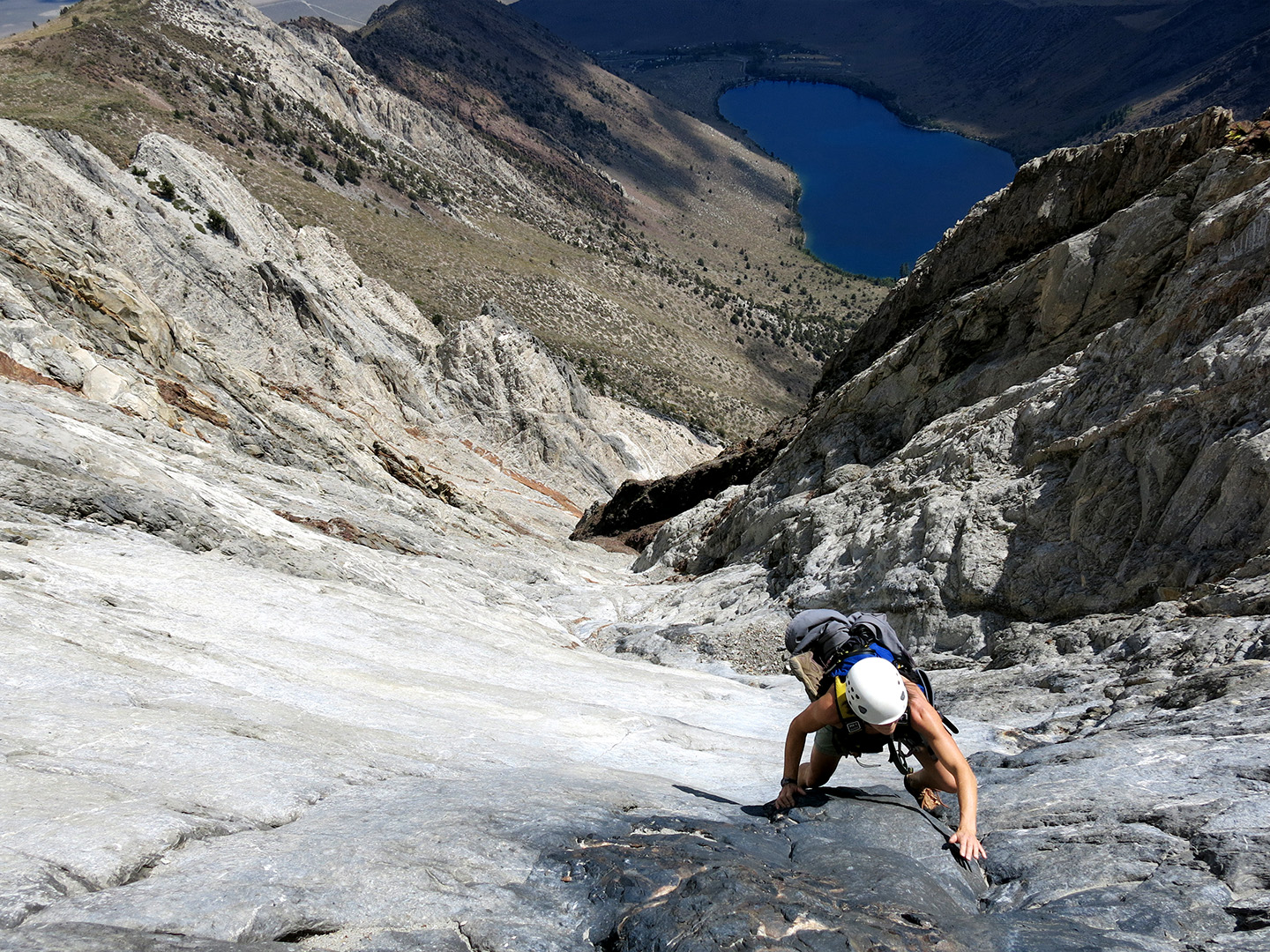 Laurel Mountain has been on our list to climb for a long time. It was mentioned in Peter Croft’s guidebook and then he recommended it to us as a great day out. Interestingly enough, it is also fairly close to Mammoth airport. Really close. In fact, we landed, got out our folding bikes, packed a small rope and some emergency climbing gear, rode “across the street” (highway 395) to Convict Lake and from there you look straight up at Laurel Mountain.