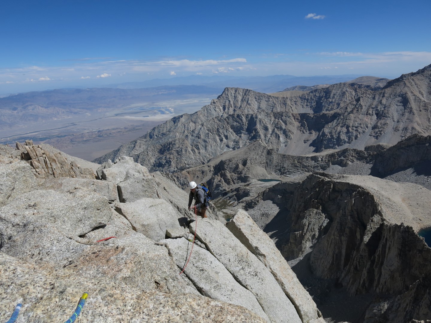 Having Peter and Howie as guides (Sierra Mountain Guides) is wonderful because it makes doing the climb in one day do-able because they move quickly on the rock, know the route and set up lightning fast belays. Betsy and I are pretty good at keeping our speed up while hiking and climbing so it worked out well. We left the car at 5:00 am and got back to the car around 5:30 pm, and then back down into Lone Pine in time to ride our bikes into town for dinner. A perfectly awesome day.