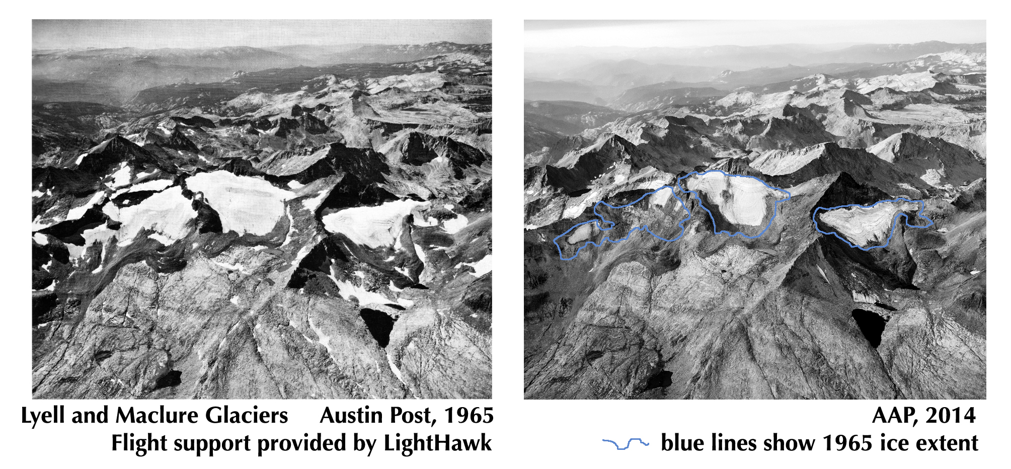 I climbed Conness from North Peak in August 1970 and have a photo similar to the 1961 photo of the glacier. Also climbed Lyell Peak via Simmons and Maclure, August 15, 1974 and have photos of the glaciers from Mt. Simmons similar to the 1965 photo.