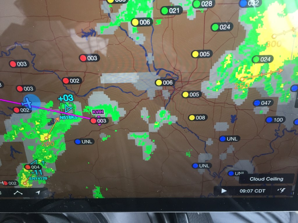 After waking up, Mark and I skip breakfast and scramble to refuel and get in the air after looking at the weather radar. The big line of thunderstorms haven’t gone away over night, but a large flyable gap has opened up near us. We launch, but we soon see that the underlying airports in the gap are below minimums, which means we can’t land even with instruments, which means that if the gap closes around us and traps us, we would have no “out”. We would be unable to land.