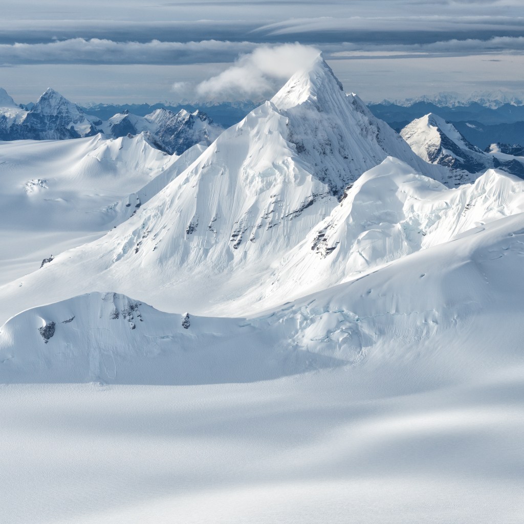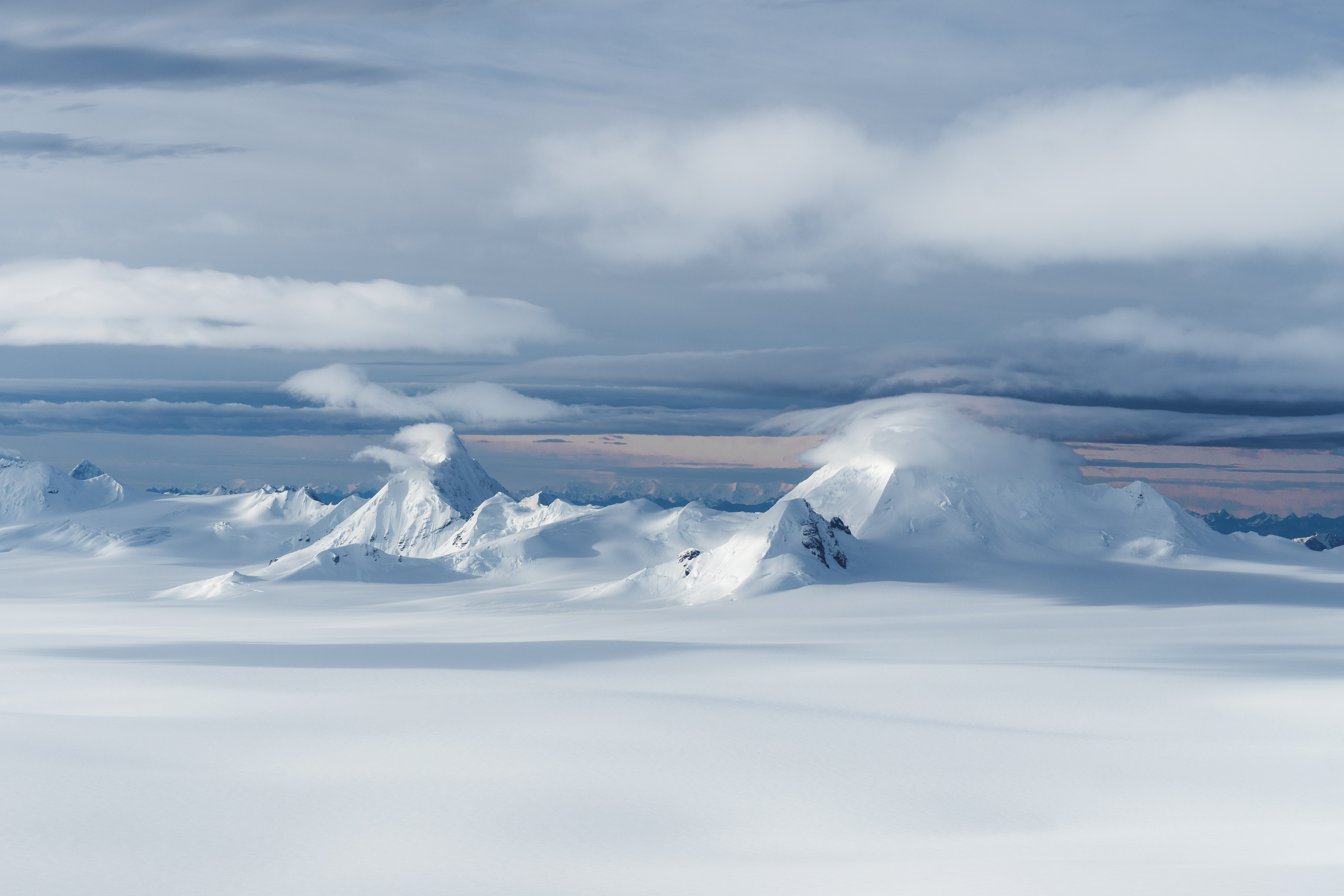 I do carry an emergency locator beacon, a Garmin Inreach satellite tracking device and a backpack of survival gear but still, the thought of this flight in the dark was just plain scary. I chickened out, waited until dawn and completed the entire flight in daylight. It turned out to be a great photo opportunity. Because of an overcast the light was soft and there was still some pink in the sky. Combined with fresh snow the scene was unbelievable. Many of these landscapes just can’t be captured with a camera and at one point I put my Sony down and did a 360 above the icefield, just taking it in.
