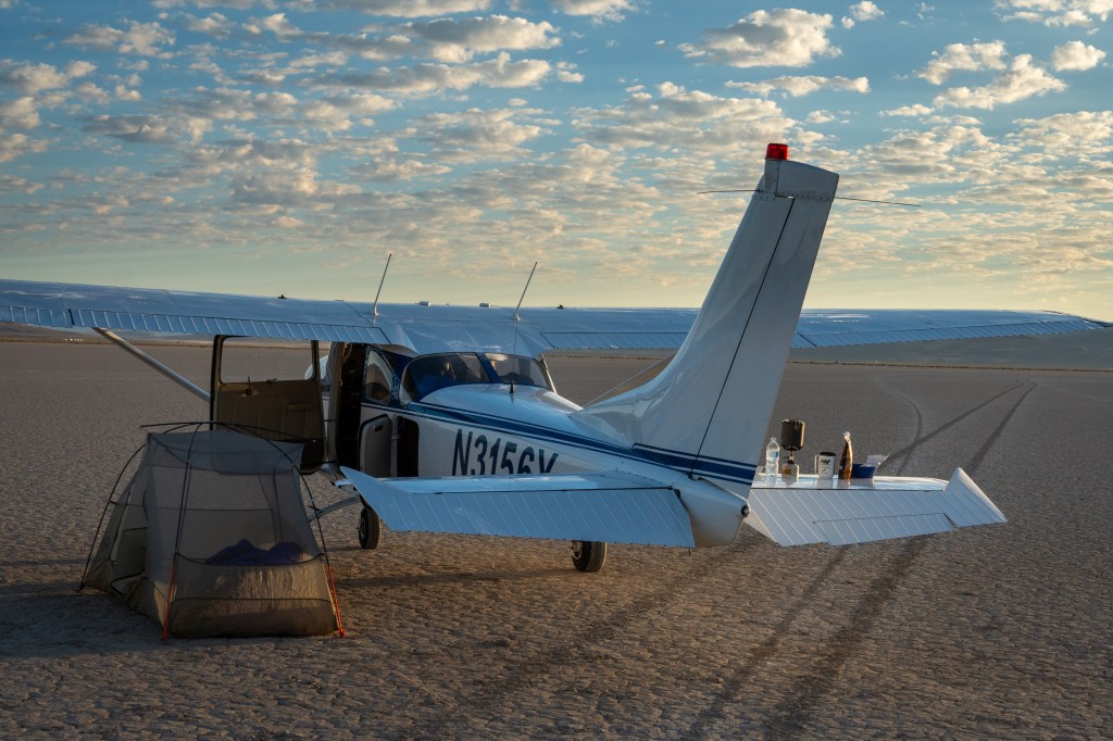 So my first big trip with the 182 was a 3 week trip to the southwest, and my first stop was the Dead Cow Lakebed, the home of the High Sierra fly-in (which is taking a hiatus this year). Betsy is driving the Sprinter (bless her heart) and I’m in the plane. Yes, it sounds silly taking both, but the trip was planned around the airplane and getting photos for a new book I’m writing. And it is super-awesome to have the van, Betsy and our 1-yr old border collie Copper along for the three week trip.