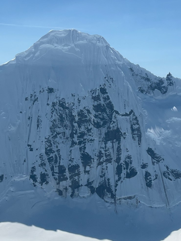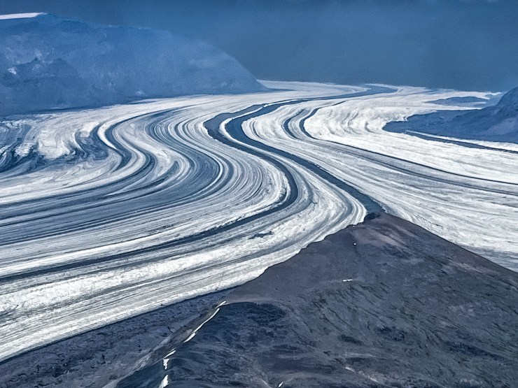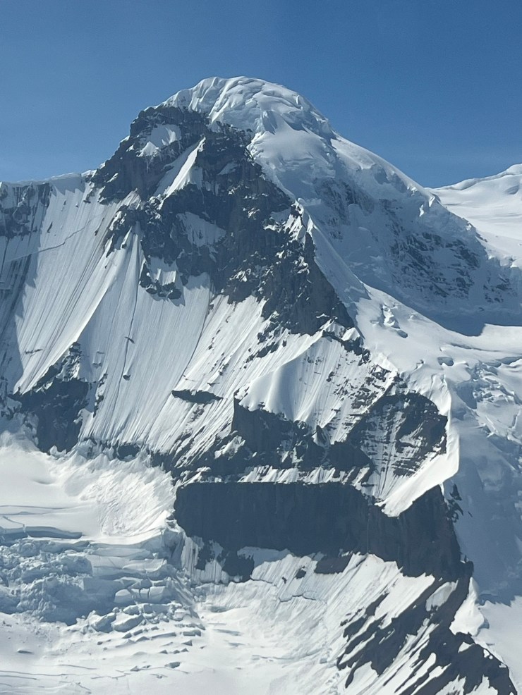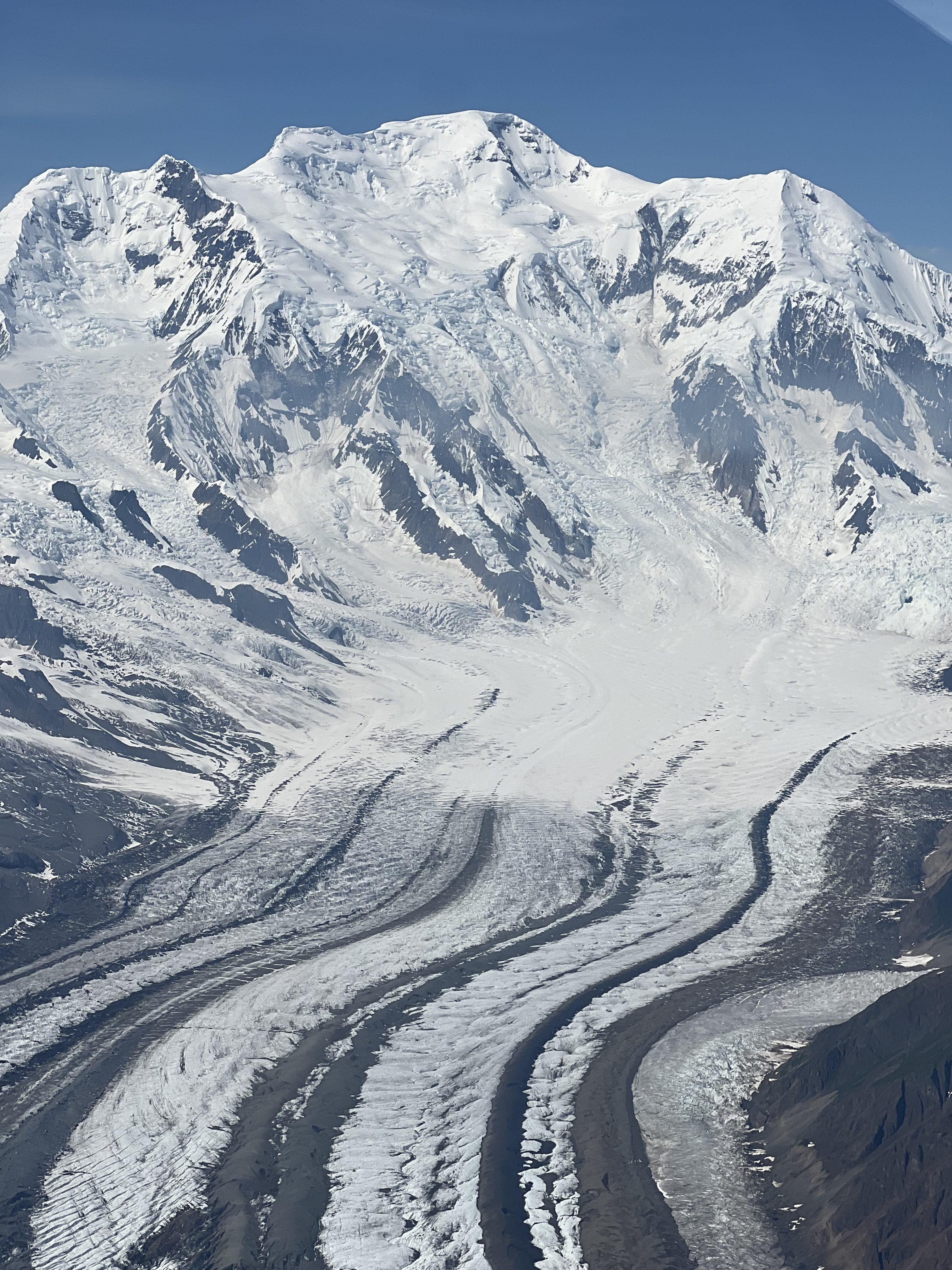 Or you can get to McCarthy by going straight over Nabesna Glacier and down the other side of the Wrangell mountains. This is a great tour, the last half is pretty much what you get when you pay for a premium flightseeing tour at McCarthy. Fly up the glacier to a massive amphitheater. My strategy for off-airport landing sites for glacier flights is when down low look for smooth(ish) gravel bars off to the sides of the glaciers. The middle of the glacier is usually riddled with crevices and is much too rough for any kind of landing. Up higher it’s smooth. Ish. On this particular flight I stayed to the right then traversed along the amphitheater from right to left while climbing.