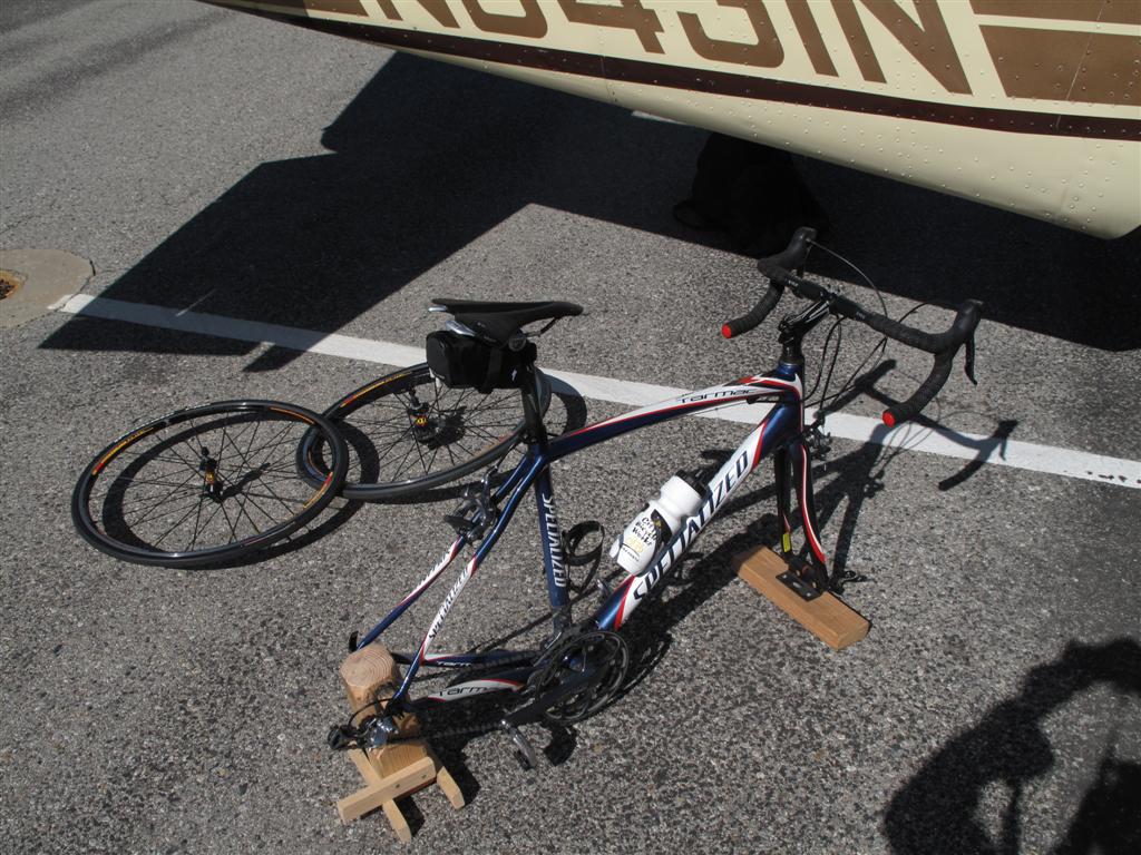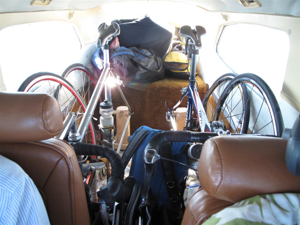 Folding Bike. I generally keep a Dahon folding bike in the plane (and Betsy has one too), unless I’m bringing a mountain bike or road bike. For mountain bikes I put down a bed sheet and basically throw the bikes in the back. Our road bikes are a little too nice for that, so I made some homemade bike stands that hold them up without wheels so that it fits nicely in the back. I then use seatbelts that are there for the seats that I removed to tie them down.