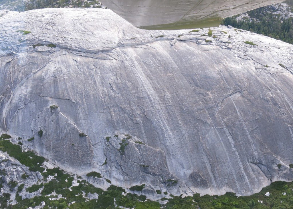 how good it looked from the air. Betsy and I decided to approach the dome from the top so that we didn’t have to depend on any of the old bolts. We found the approach from the side and up the dome wasn’t as much of a bushwack as heading straight to the face. We then pulled some of the old bolts we found, drilled and installed new rappel anchors to get down to the climbs and check them out. When we finally got down to see the climbs we were stunned. Empty walls of beautiful, clean steep granite with rusty bolts here and there. It was like going to an amusement park and the rides are running but no one is around – strangely empty.