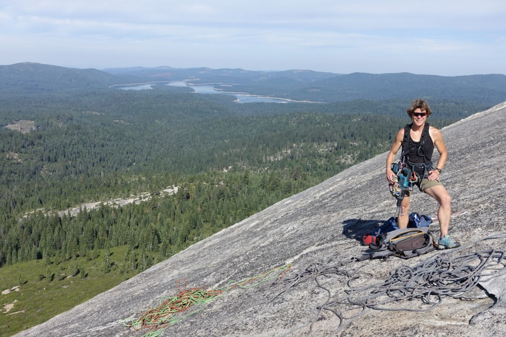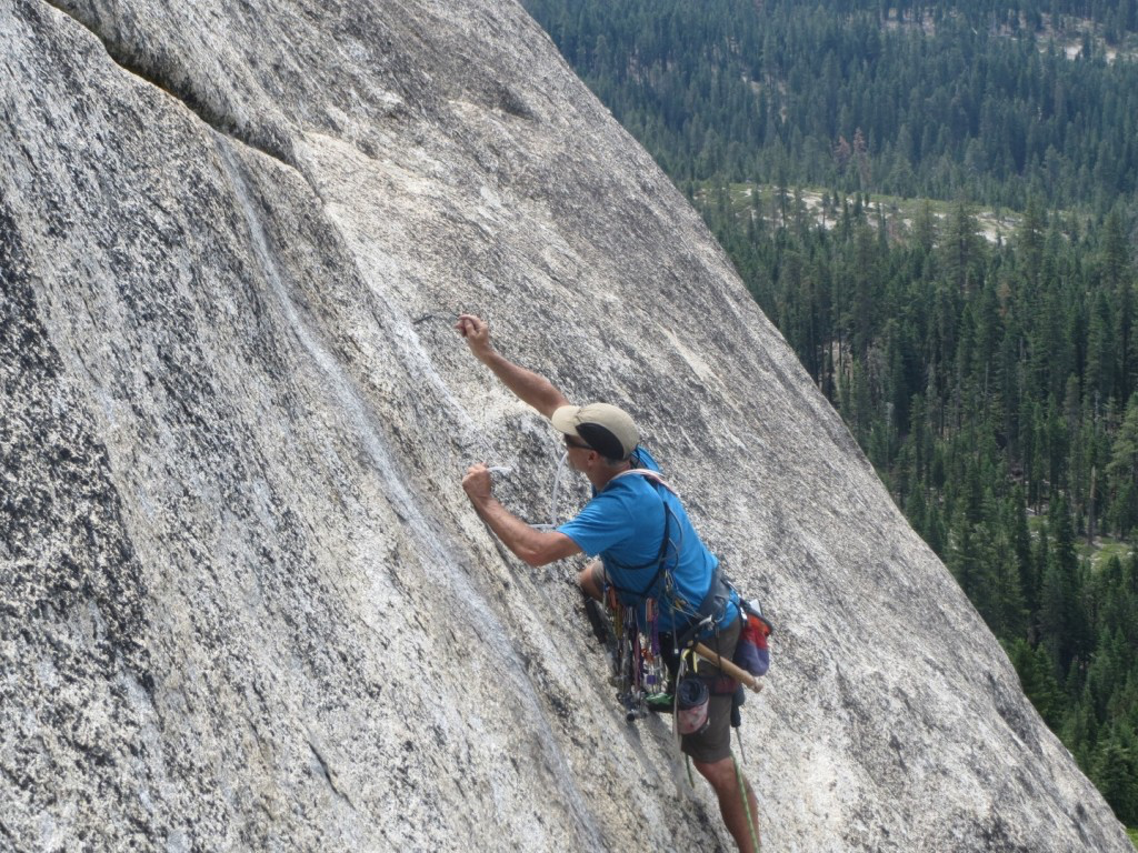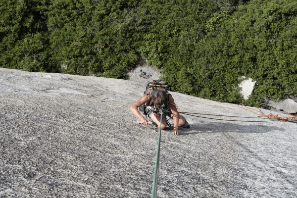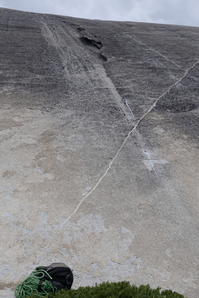 Crystal Chute was the first climb we actually climbed after rebolting and we were thrilled that it met our expectations. It is a great route that starts up past a dike, into a flake system that runs out and dumps you back on the face and then up over a small roof. As with most climbs, it gets runout on the second pitch, but the slope of the dome eases so it is an easy romp at that point.