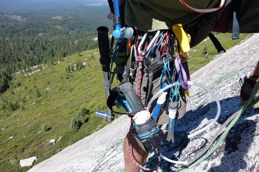 I scared myself putting up Naptime, a 5.9 with few good stances and while packing our big oversized Makita rotary hammer. You don’t want to fall with that thing. At one point the drill ran out of power and stopped, I panicked and stuck a wedge bolt in the shallow hole and girth-hitched a sling around it. I then realized it was permanently stuck that way and I should have put it in temporarily backwards. It was hell getting rid of that bolt, which finally succumbed to a sawzall, tapped back in and epoxied over. (I didn’t read until later that you can connect a drill and basically spin a wedge bolt to death).