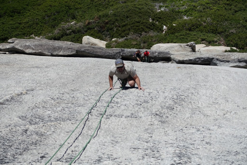 Later in the project Ron Vardanega, one of the first ascensionists on many of the old climbs, and his friend Charlie Downs came out to rebolt one of Ron’s old routes (Previously unnamed, now named Crystal Blue Persuasion). On the way up the dome Ron said, “so um, why are we hiking up to the top of the dome?” Then a little later Charlie said, “so um, why are we hiking up to the top of the dome?”