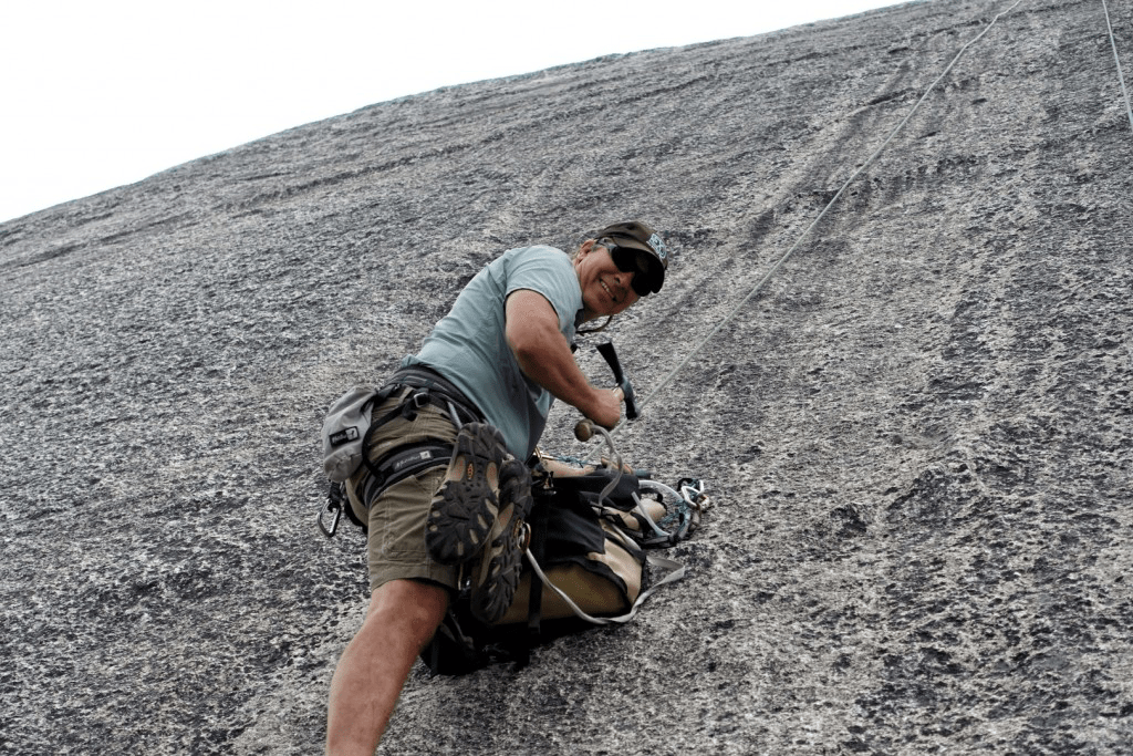 In the land of dikes and cracks at Lover’s Leap and the spires at Sugarloaf and Phantom Spires, this fantastic granite dome has been overlooked for decades. Basically hidden in the bushes. Originally developed in the early 1980s by Bob Branscomb, Don Garret and Ron Vardanega, it has sported rusty ¼” bolts and a heinous bushwack approach ever since, which has dissuaded many (including us) from going there. Actually we tried to go there years ago with our kids but after bushwacking and scratching ourselves up we turned around once we got to the climbs.